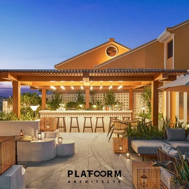 Every seating arrangement is thoughtfully oriented towards the river and the resort's core, utilizing clever spatial navigation. The visual axis of the pool culminates at the open-concept bar. With its oak timber structure and polished concrete counters, the bar serves as a gentle focal point—a relaxed, unforced conclusion to a serene landscape journey.